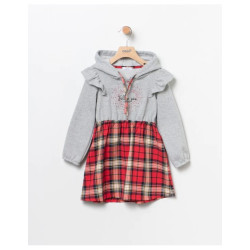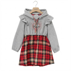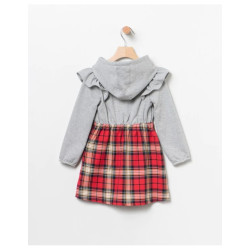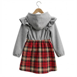 Vestido niña COCO ACQUA tipo sudadera gris con capucha, manga larga y volantes. Falda de cuadros tartán rojos con cintura fruncida. Ideal para looks de otoño e invierno.
