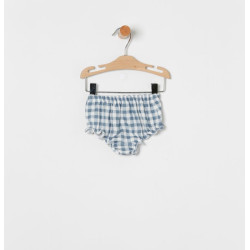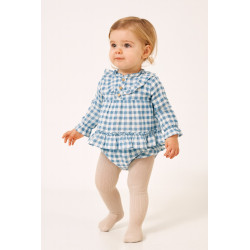 Vestido mas braguita de bebe niña en tejido de cuadros en tonos azules, volantes en el cuello y pecho. Botones decorativos.