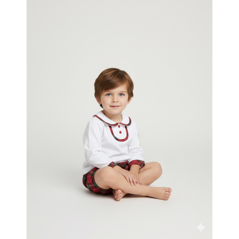 Conjunto bebé de dos piezas: camisa blanca de manga larga con cuello bobo y detalles tartán + bombacho de cuadros rojos y verdes. Ideal para Navidad y eventos.