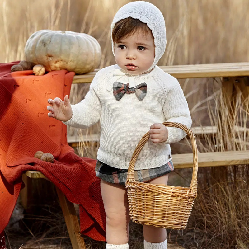 Conjunto de bebé de estilo clásico y muy elegante de JULIANA, ideal para temporada otoño-invierno y para ocasiones especiales. Combina un jersey de punto color crudo con una ranita bombacho de cuadros tartán a juego, creando un look cuidado, cómodo y con un toque “british” atemporal.