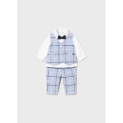 Conjunto de ceremonia para bebé niño: camisa blanca, chaleco y pantalón a juego en azul a cuadros y pajarita negra. Ideal para bautizos, eventos y ocasiones especiales.